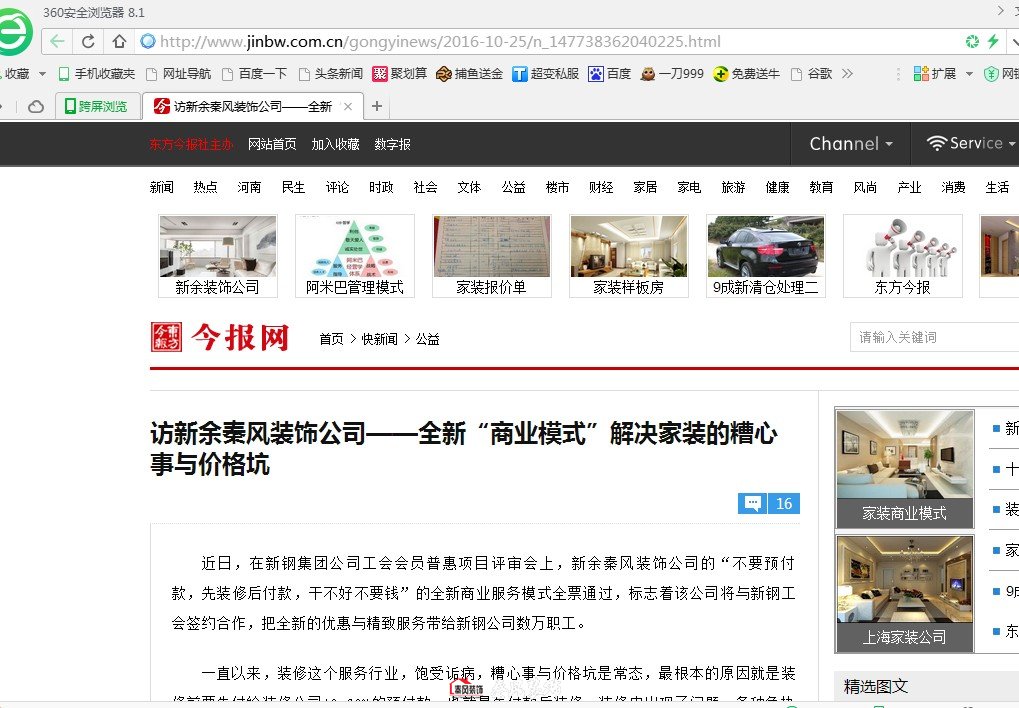 日前,新余市秦風(fēng)裝飾公司采用“先裝修后付款”這一全新的商業(yè)模式,徹底解決了家裝中的糟心事與價(jià)格坑,這一模式引起了人民網(wǎng)記者的采訪,在人民網(wǎng)發(fā)布后,新浪網(wǎng)、騰訊、今報(bào)網(wǎng)、中國商業(yè)網(wǎng)、中國網(wǎng)等中央級(jí)媒體紛紛轉(zhuǎn)載,引起了裝修界和媒體界的廣泛關(guān)注。